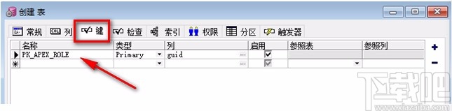 4.然后我们点击窗口顶部的“键”选项,并在其下方设置创建表的主键,这一步非常重要。