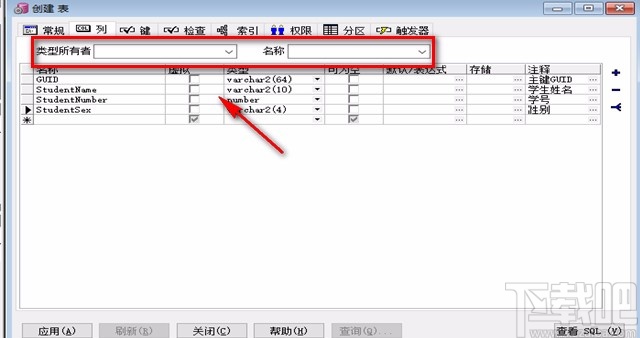 3.窗口顶部还有“列”选项,点击该选项,并对其下方的“类型所有者”、“名称”、“注释”、“类型”等参数进行设置。
