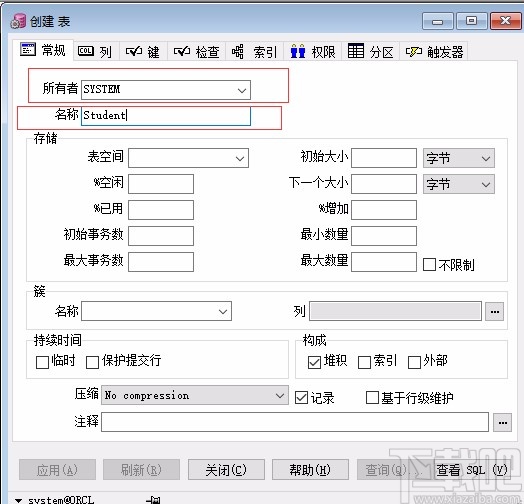2.接着界面上就会弹出一个创建表窗口,点击窗口顶部的“常规”选项,并在窗口中的“所有者”、“名称”文本框中输入对应的文本内容,其他参数可以默认设置,也可以根据自己的需要手动设置。