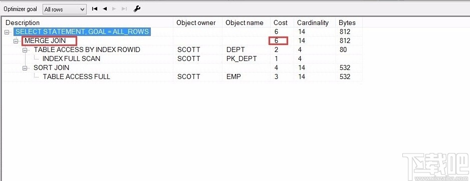 5.最后我们还可以通过查看执行计划表格的cost列,即成本花费能够知道哪个步骤花费的成本高,通过查看执行计划表格的行中的objectname列,能够知道是否使用到表中的索引。