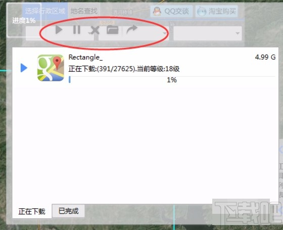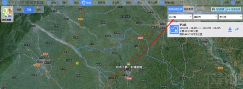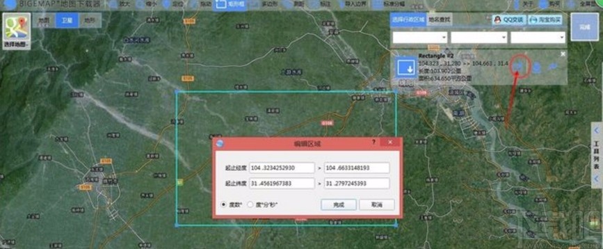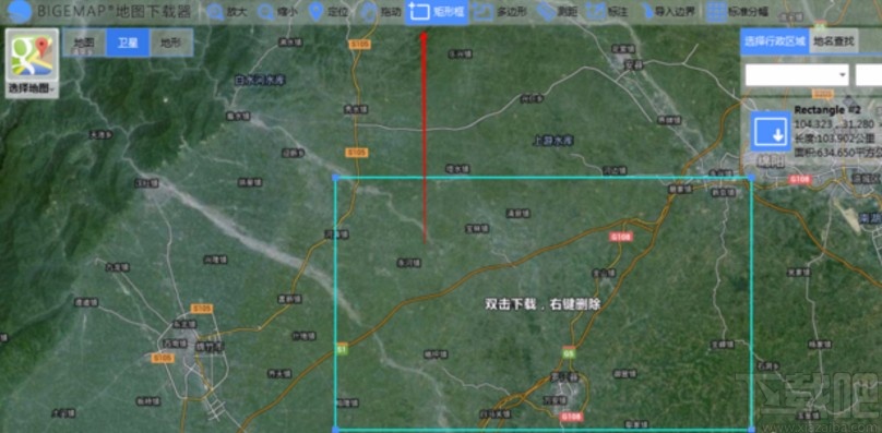 1.首先第一步我们打开软件之后,在软件上方点击矩形框,然后调整矩形框大小来选择想要下载的卫星地图范围,如下图中所示。