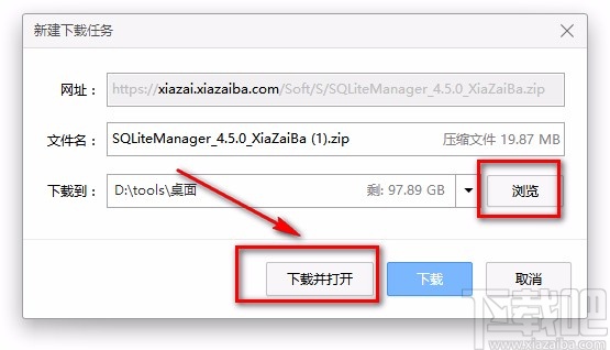 3.然后界面上会弹出一个新建下载任务窗口,我们点击窗口右下方的“浏览”按钮进入到浏览文件夹页面选好软件的下载位置后,接着在窗口底部找到“下载并打开”按钮,点击该按钮进入到解压文件夹页面。