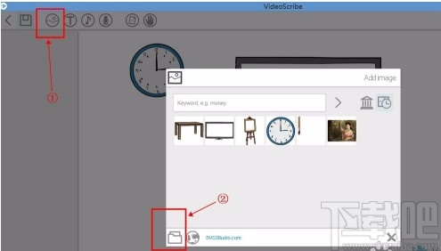 7.接下来在videoscribe软件的界面左上方找到图片按钮,点击该按钮会有一个窗口出现在界面上;我们点击窗口左下角的文件打开按钮进入到文件添加页面。