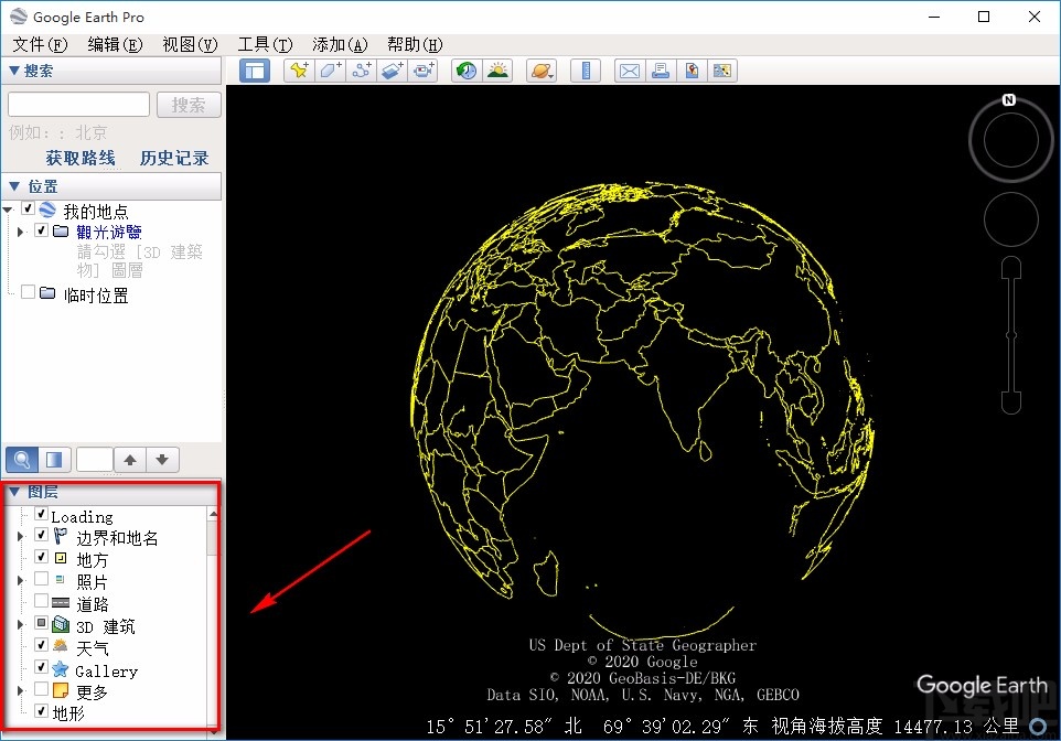 3.在界面左侧还可以查看到“图层”选项,我们在该选项下方可以查看到“照片”、“道路”、“建筑”等,可以利用这些选项查看地球上的具体事物。