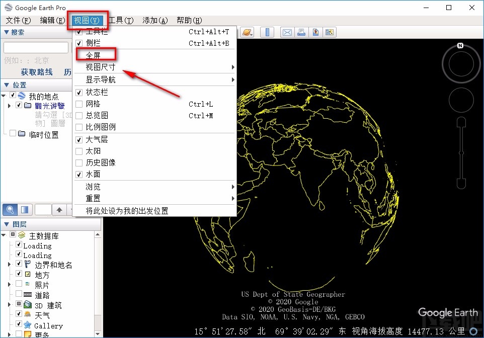 2.接着在界面左上角找到“视图”选项,点击该选项会出现一个下拉框,我们在下拉框中点击“全屏”选项,就可以进入到全屏模式浏览地球。