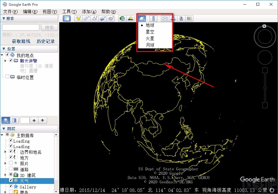 4.在界面顶部工具栏中可以找到一个地球形状的图标按钮,点击该按钮会出现一个下拉框,我们可以在下拉框中点击“地球”、“星空”、“火星”、“月球”来查看相应的模型图。