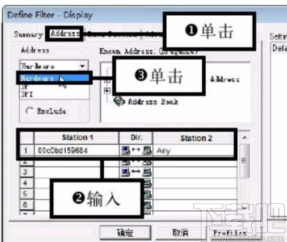 3.点击这个选项之后就会打开设置捕获条件的窗口,切换到Address这个选项卡下面之后,在Station1和Station2的列表中输入捕获地址,最后选择Hardware这个选项。