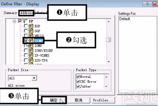 4.紧接着下一步是需要编辑协议捕获条件,我们将界面切换到Advanced这个选项卡,然后在列表中选中捕获条件,勾选IP下方的ICMP这个选项之后点击确定按钮。