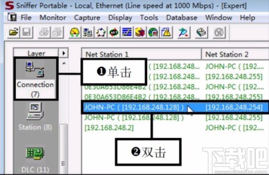 6.等到捕获完成之后,我们点击左边的Connection这个选项之后,在右边的窗口中就可以看到捕获到的信息包和一些发送和接收数据包的计算机地址了,双击其中一条数据包信息可以查看对应的信息。