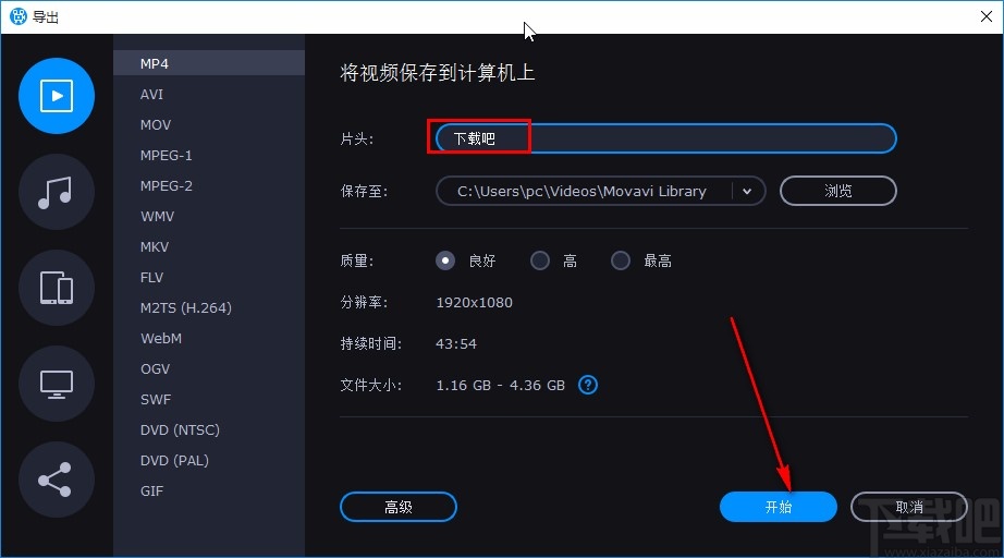 7.选择好导出视频的格式之后,设置好文件的名称和保存路径,我们就可以点击下方的开始按钮开始导出添加音乐后的视频了。