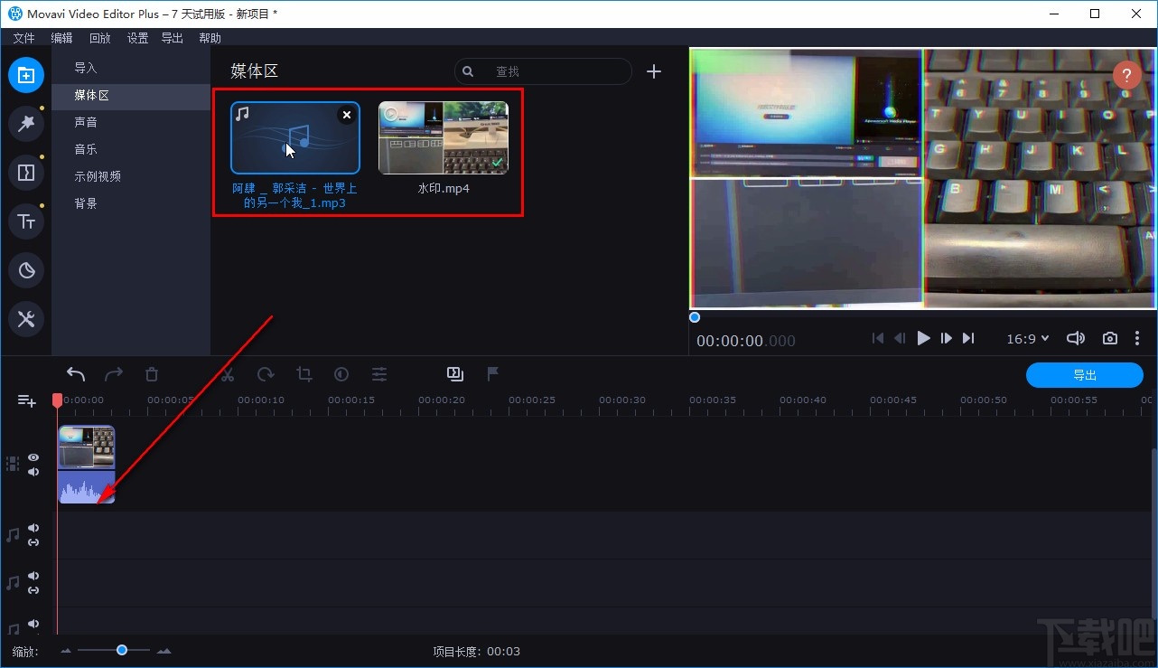 3.点击打开按钮将视频个音乐文件都添加到软件之后,我们分别点击它们,将它们拖动到下方的操作台当中。