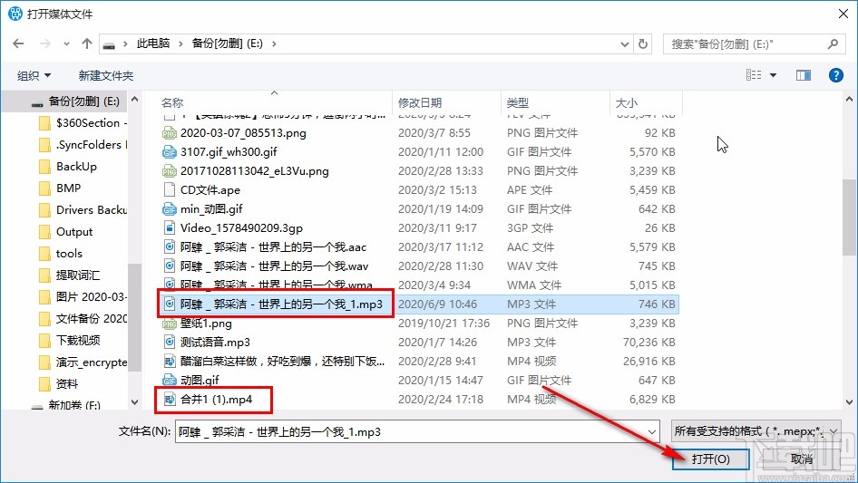 2.点击添加文件按钮打开选择文件的界面之后,我们找到想要添加音乐的视频文件,再找到想要添加到视频中的音乐文件,按住键盘ctrl键将它们两个都选中之后点击打开按钮。
