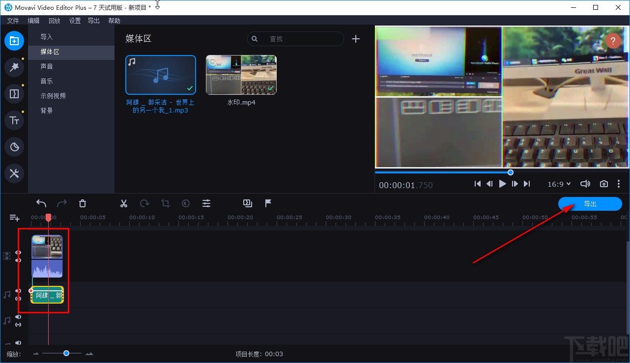 5.我们将音乐和视频的时长调整到一个合适的位置之后,点击右边的导出按钮即可将视频音频合并导出。