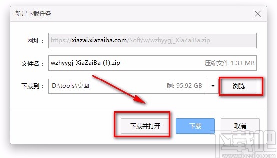 3.然后界面上会弹出一个新建下载任务窗口,我们点击窗口右下方的“浏览”按钮进入到浏览文件夹页面选好软件的下载位置后,接着在窗口底部找到“下载并打开”按钮,点击该按钮进入到解压文件夹页面。