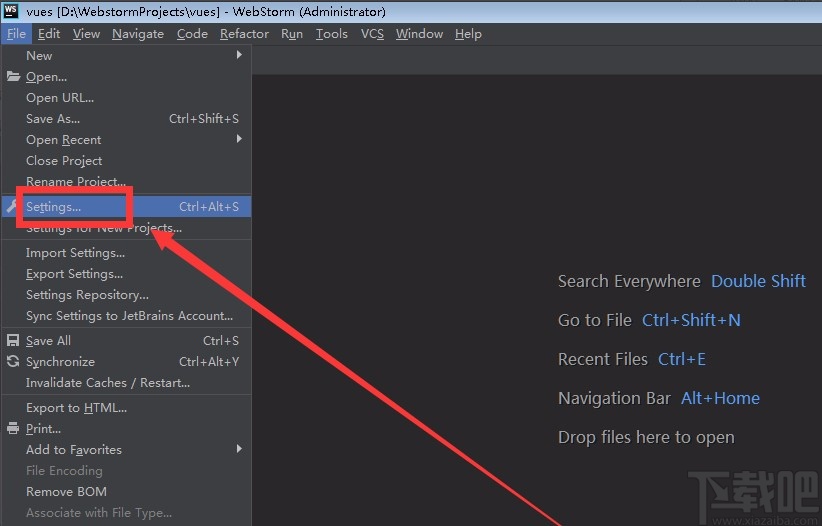 5.之后进入到软件主界面,在界面左上角找到“File”选项,点击该选项会出现一个下拉框,我们在下拉框中选择“Settings”,打开设置窗口。