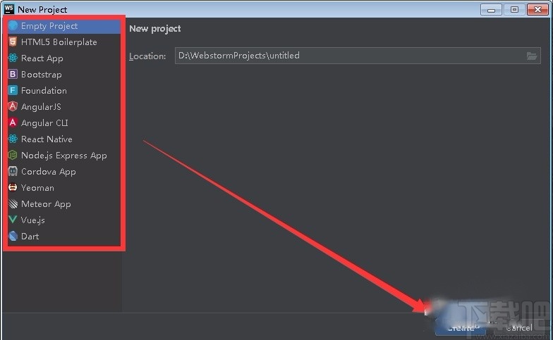 2.接着根据自己的需要,在界面左侧选择项目类型和框架,输入项目名称,再点击界面右下角的“Create”按钮即可。
