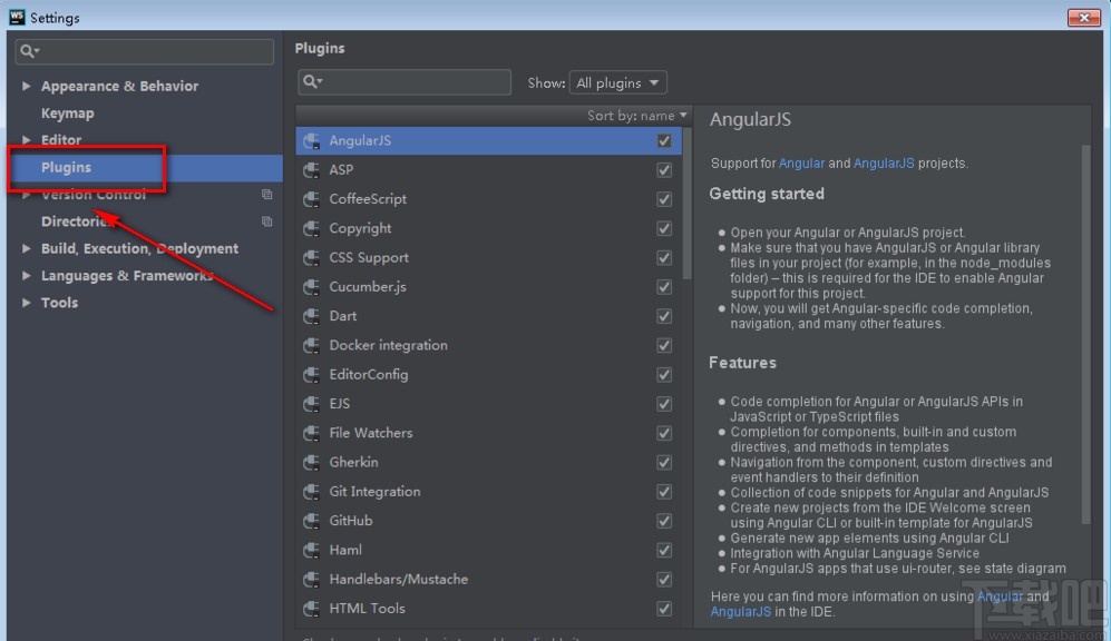 8.在窗口左侧找到“Plugins”并点击,在界面上就可以查看到已安装的插件,还可以选择需要安装的插件。