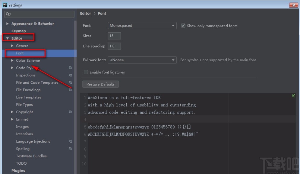 7.在设置窗口左侧还可以找到“Editor”选项并点击,在下拉框中选择“Font”子菜单,可以设置编辑时的字体大小、字体属性等。