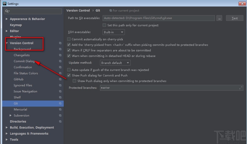 9.在窗口左侧找到“Version Control”选项,点击该选项会出现一个下拉框,我们在下拉框中可以看到各种控制和管理项目的工具。