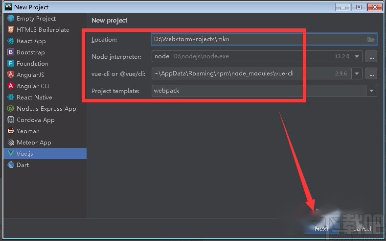 3.然后在界面左侧选择“Vue.js”语言框架,在界面上方设置项目位置、编辑工具等,再点击界面右下角的“Next”按钮。