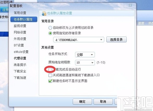 3.点击切换到任务默认属性界面之后,我们在其他设置模块就可以看到“下载完成后自动运行”这个功能了,选项的方框是勾选状态。