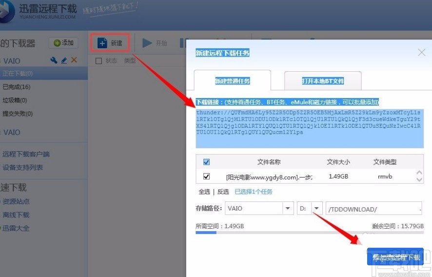 4.我们在页面上点击新建按钮,将想要下载的任务地址粘贴到新建下载任务界面,之后选择为远程下载电脑的路径,再点击添加到远程下载就可以开始远程下载文件了。