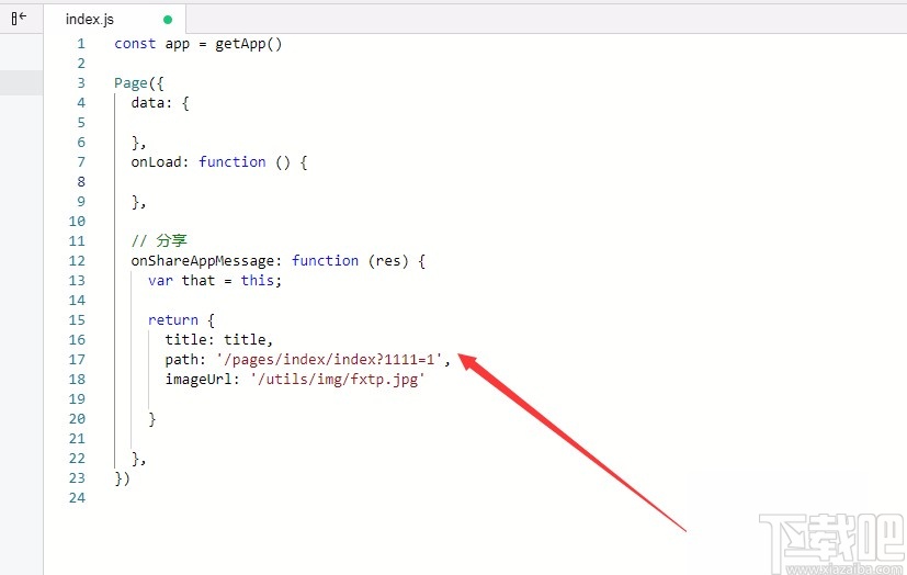 2.紧接着我们开始编写想要编译调试的代码,在代码编写位置编写完成之后如下图中所示,小编就以一个分享功能的代码调试来跟大家演示。