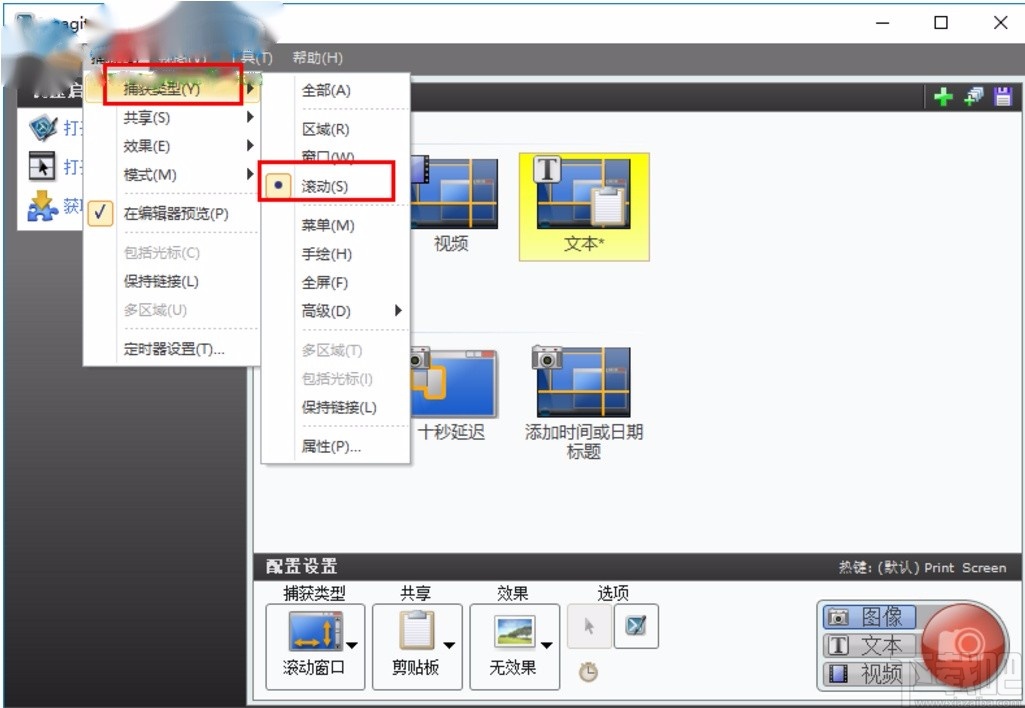2.接着在界面左上角找到“捕获”选项,我们点击该选项会出现一个下拉框,在下拉框中选择“捕获类型”,其旁边还会出现一个子下拉框,在下拉框中选择“滚动”。