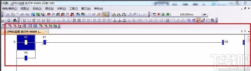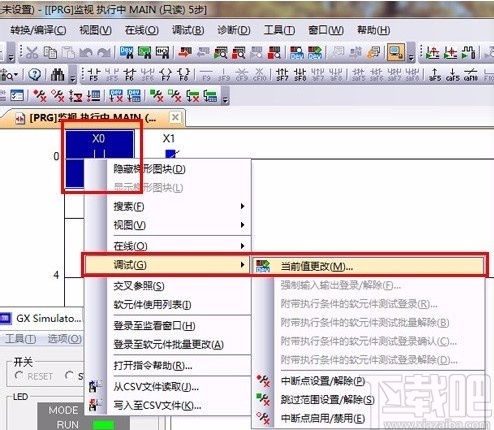 5.接下来在界面上的操作编辑区中选择梯形图中的元件XO,再点击鼠标右键,在出现的下拉框中选择“调试”选项,并在旁边的子下拉框中选择“当前值更改”。