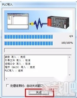 3.然后界面上就会弹出一个PLC写入窗口,等待窗口中出现“PLC写入:结束”字样,再点击窗口底部的“关闭”按钮即可。