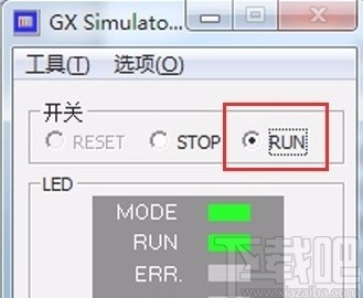 4.这时界面上就会出现一个GX Simulator窗口,在窗口中选择“RUN”或者“STOP”就可以启动或停止仿真。