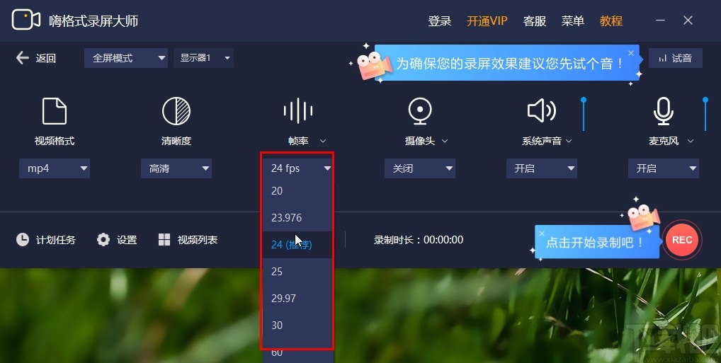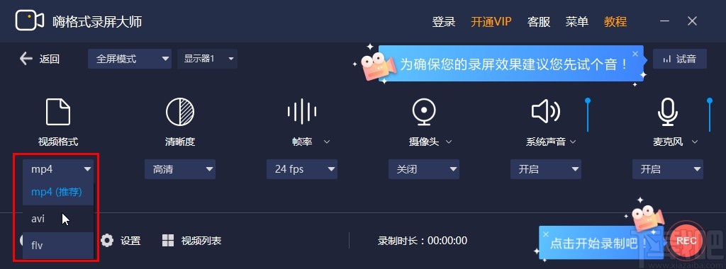 2.点击进入到全屏模式之后,我们在左边找到视频格式选项,打开下拉选项可以选择录制视频的保存格式。