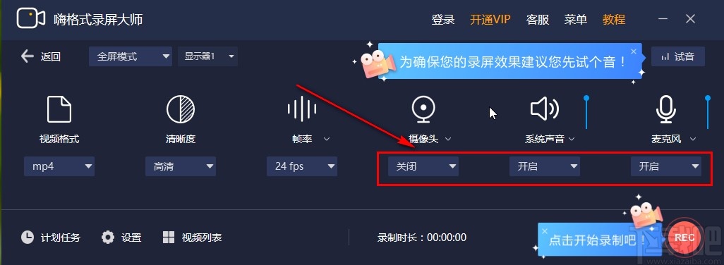 5.之后是对录制视频过程中的摄像头、系统声音以及麦克风声音进行选项,根据用户自己的需求选择开启或者关闭。