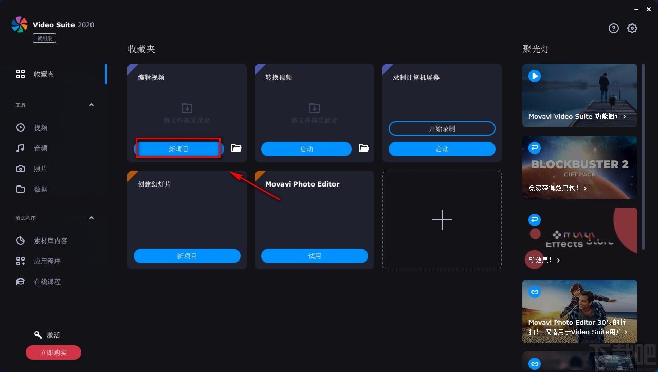 1.首先打开软件,在软件界面上找到“编辑视频”选项,点击该选项下方的“新项目”按钮进入到视频编辑页面。