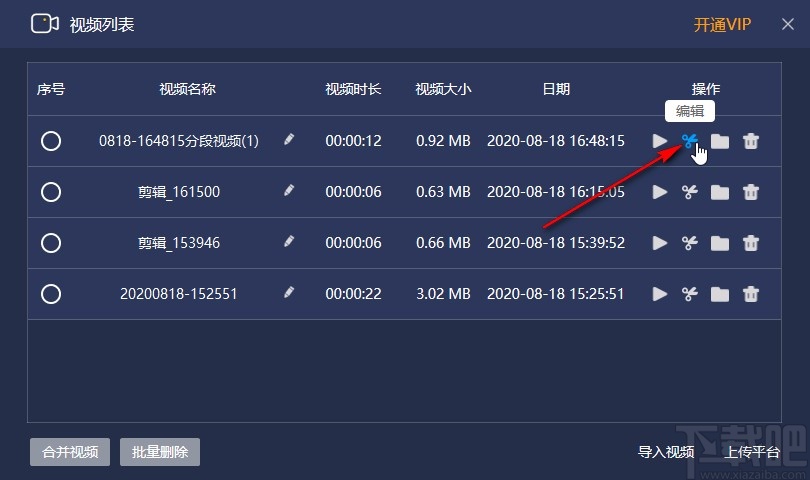 2.打开录制视频的列表之后,找到想要编辑的视频文件,点击它后面的剪刀图标准备进行视频编辑。