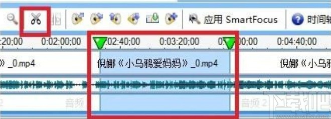 5.接着我们移动视频轨道上的指针,然后调整想要剪切视频的时间段,移动指针选取时间段之后,点击上方的剪刀图标。