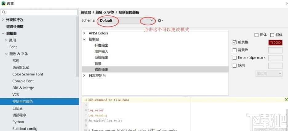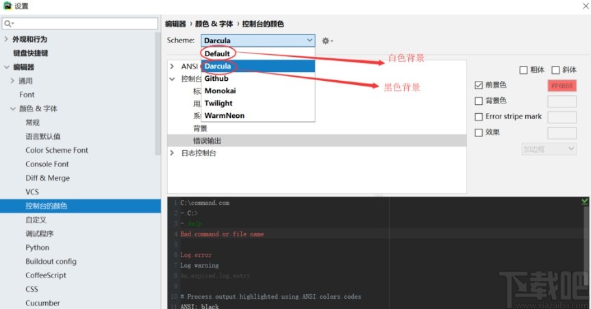 5.点击这个控制台颜色之后在出现的右边界面中就可以看到设置控制台颜色的选项了,我们点击下拉列表选择颜色即可。