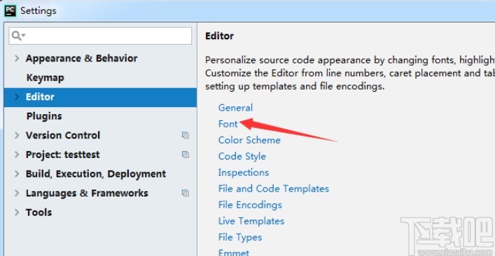 4.之后在打开的选项界面右侧找到Font这个字体设置选项,点击之后可以打开字体的设置模块。