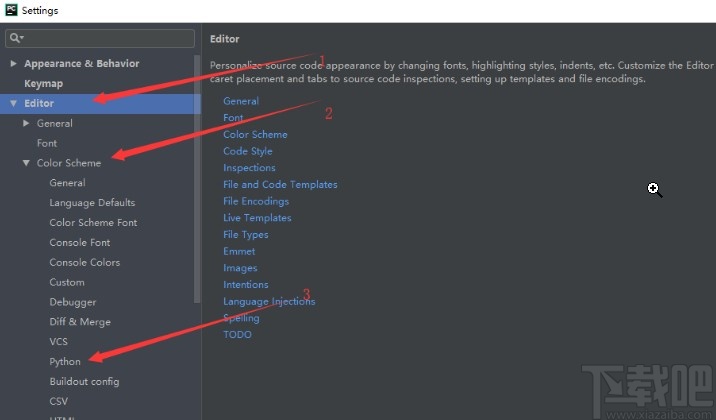 2.点击设置之后在打开的设置界面左边,找到Editor这个编辑选项,打开它下面的Color Scheme选项,找到我们想要修改代码颜色的语言文件类型Python并点击。