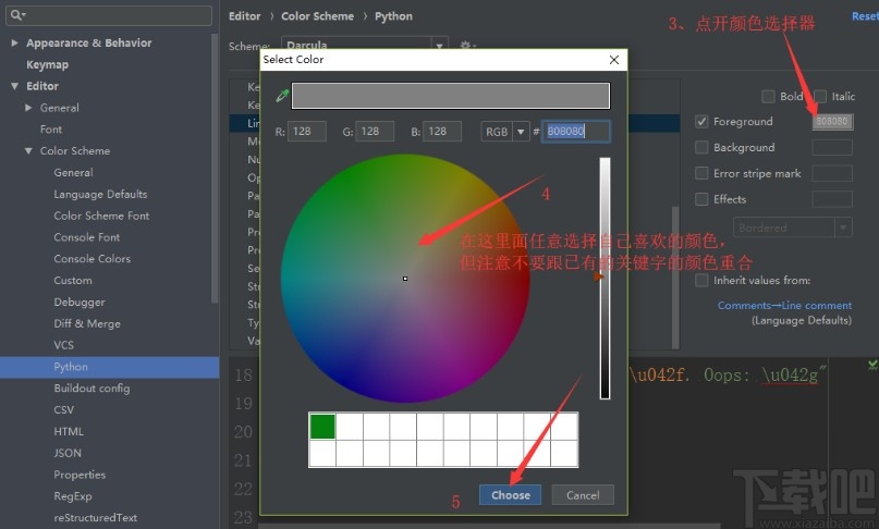 5.点击选中之后,先点击右边的颜色设置按钮,打开颜色设置界面之后,用鼠标在颜色圈里选择想要设置的颜色即可,选择的时候注意与其他代码的颜色进行区分,之后点击Choose按钮选择保存即可。