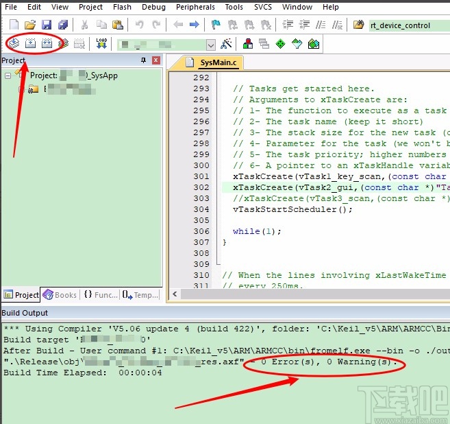 5.最后在菜单栏中找到下图所示的图标按钮,我们点击该按钮就可以编译工程,同时界面下方的窗口中会输出编译信息。
