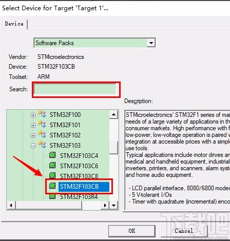 2.接着界面上就会弹出一个窗口,我们在窗口左侧选择需要开发的芯片型号,再点击窗口底部的“OK”按钮即可。
