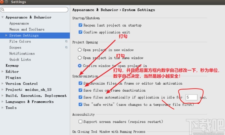 5.另外我们打开软件的设置界面,在System Settings设置选项中,找到Synchronization这个模块,然后将它下面的选项都勾选起来,勾选之后在第三个选项右边输入固定的秒数,表示的意思就是每多少秒进行一次自动保存,自动保存功能可以随时保存用户编写增加的代码,避免软件bug导致代码丢失。