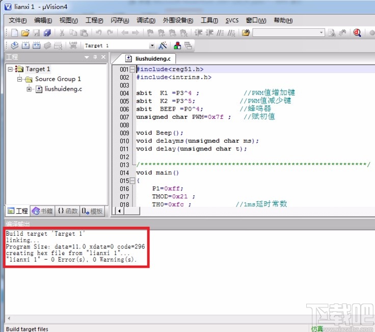 3.编译结束后,编译的信息就会出现在Build窗口中,窗口中出现了“0 Error(s).0 Warning(s)”的提示字样,就表示没有错误的语法出现;如果存在错误的语法,我们可以双击该行,然后就会定位到出错的位置再进行相应的修改。