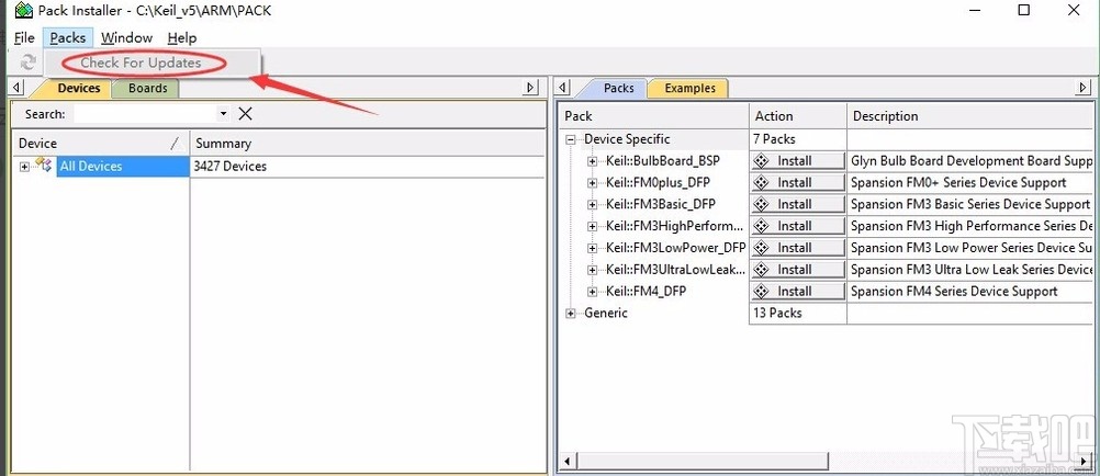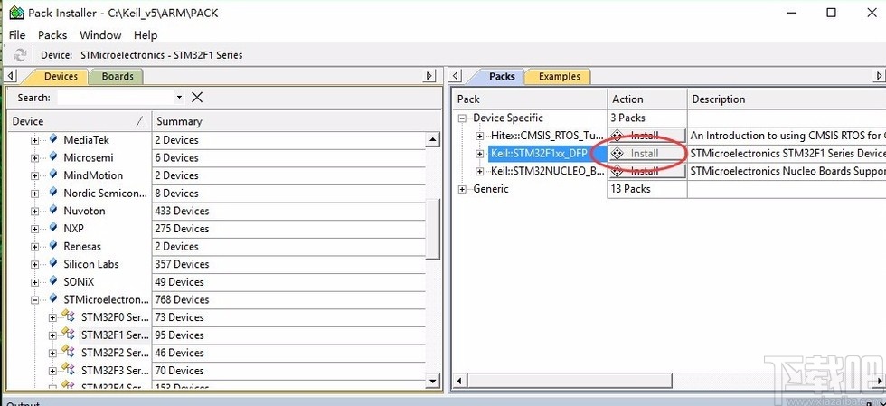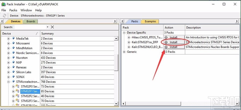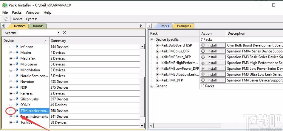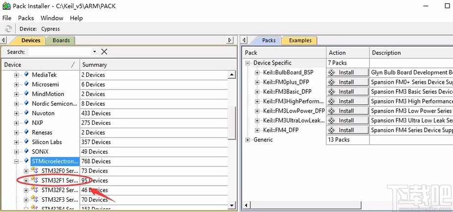 6.随后我们窗口右侧的“Device Specific”一栏中可以查看到上一步选中的型号,我们点击该型号后面的“Install”按钮安装库文件。