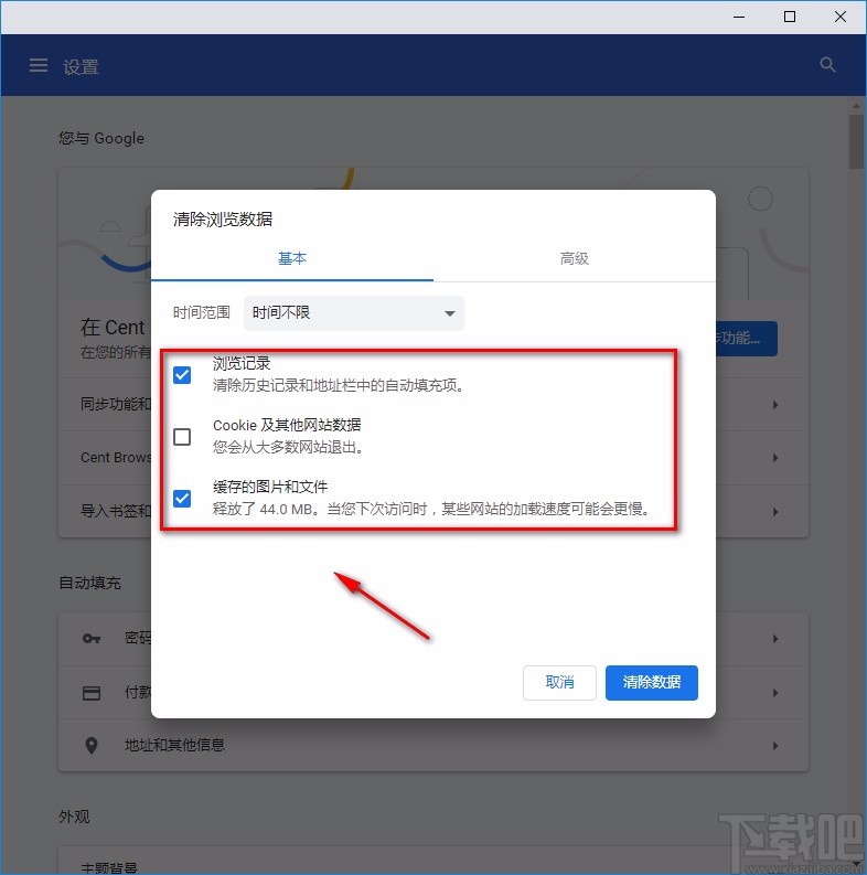 4.然后我们根据自己的需要,在窗口中找到需要清除的缓存数据,并点击其前面的小方框使其打钩。