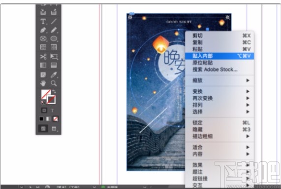 4.接下来我们在工具栏中用直接选择工具激活路径,并在图片上右击鼠标,在弹出的下拉框中选择“贴入内部”即可成功制作好图片蒙版。