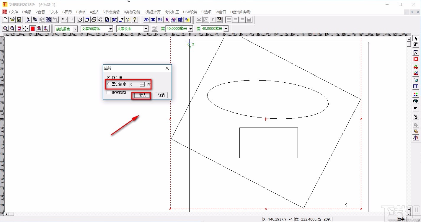 6.最后界面上就会出现一个旋转窗口,我们在窗口中选择“固定角度”选项,并根据自己的需要在该选项后面输入角度数值,再点击窗口中的“确认”按钮即可旋转图形。