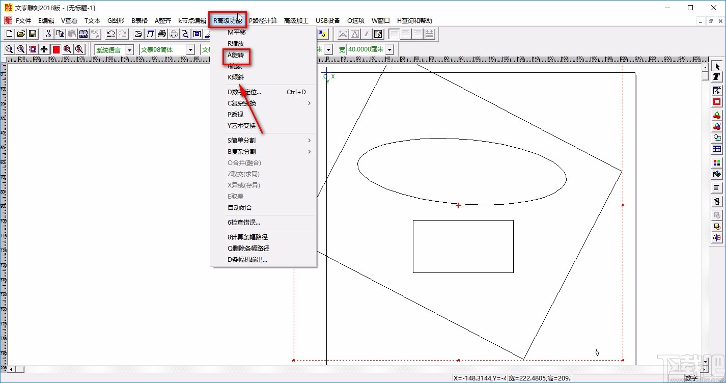 5.还有一种方法就是框选多个图形后,我们在界面顶部的菜单栏中找到“R高级功能”选项,点击该选项会有一个下拉框,在下拉框中点击“A旋转”。