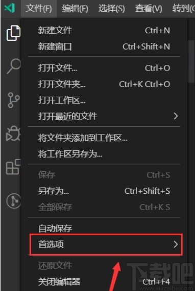 2.点击文件之后在出现的选项菜单中,找到首选项这个选项之后点击它,如下图中所示。